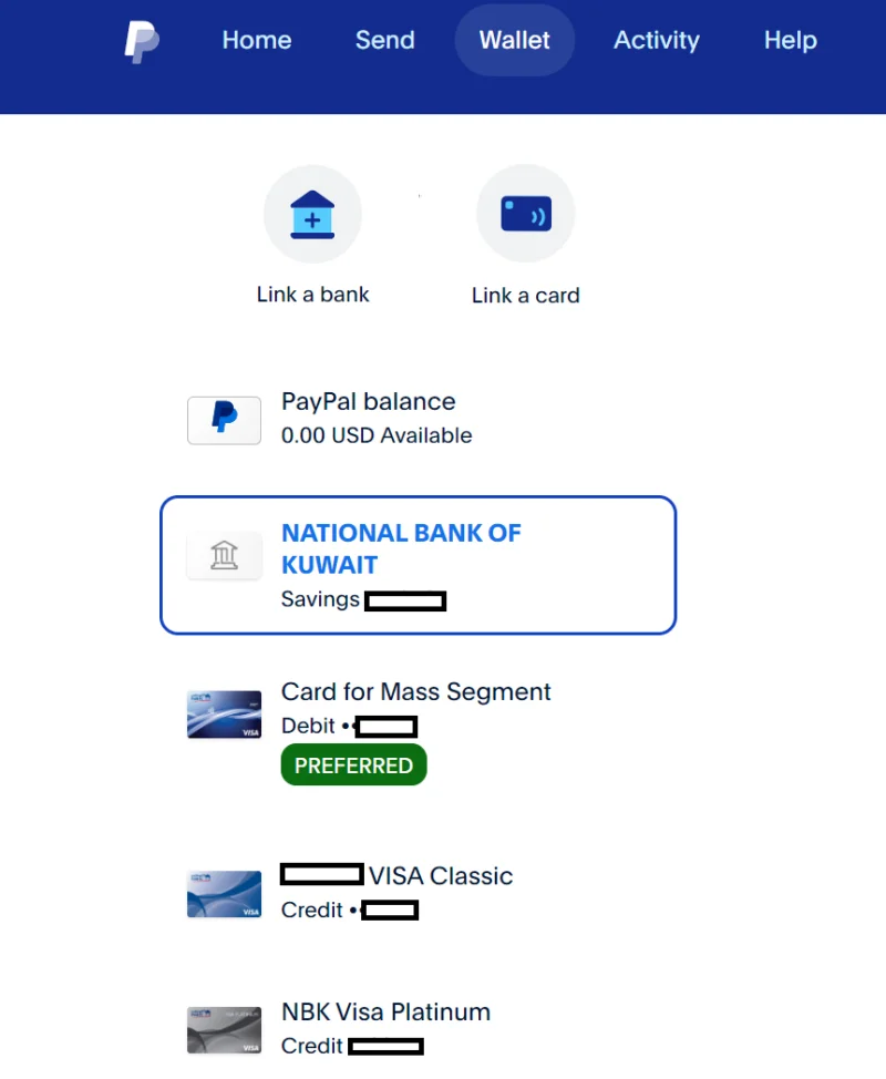 قمت بربطت احد البنوك لحسابي في Paypal وتمت العملية بشكل سلس و بثواني قليلة , و كما في الصورة في الأسفل اضفت حساب بنك الكويت الوطني من ضمن البطاقات للدفع و لسحب الأموال , ربما سبقني الكثير بهذي الميزة و ربما لا يعلم الآخرون كما حصل معي ! بكل الأحوال انا اخبرك الآن ان ربط حساب بنك كويتي مع خدمة Paypal اصبحت متوفرة .